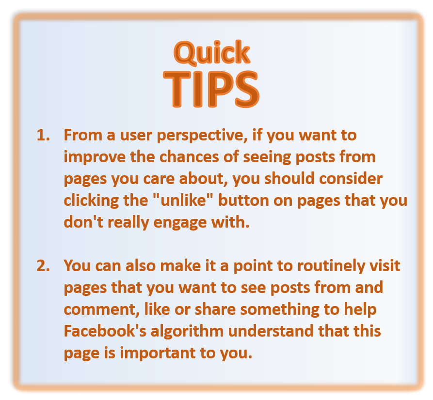 And finally, as a general user of Facebook, if you want to improve the chances of seeing posts from pages you care about, you should consider clicking the “unlike” button on pages that you don’t really engage with. You can also make it a point to routinely visit pages that you want to see posts from and comment, like or share something to help Facebook’s algorithm understand that this page is important to you.