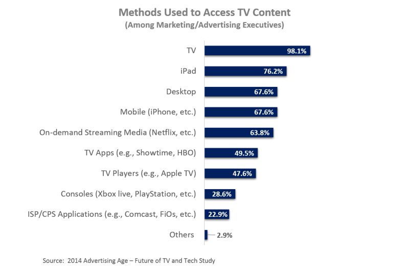- While 98.1% still access TV via their TVs, as evidenced by the chart below, marketing and agency execs are using multiple devices to watch programming content