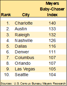 As Baby Boomers retire from the workforce and their Millennial children start families, a new trend has emerged: “Baby Chasing.” According to a new study from Meyers Research, 25 percent of Baby Boomers are moving to be close to their adult children and grandchildren, wherever they’ve landed, to provide moral and even financial support. And that’s increasingly happening in geographic areas that not only offer warmer weather but also economic growth and a lower cost of living.