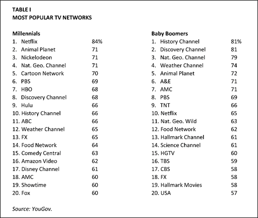 So, what do Millennials watch? Media Dynamics recently shared results of a research study by YouGov who asked Millennials about TV networks, and not surprisingly, Netflix came out on top, with 84% of Millennials citing it as “most popular.” However, many “pay TV” networks also made the cut with Millennials; as shown in Table I, Animal Planet, Nickelodeon, the National Geographic Channel and Cartoon Network rounded out the top five most popular networks, while Discovery, ABC, FX, the Weather Channel, Comedy Central, Fox and others also scored well. As a point of comparison, this has been compared to Baby Boomers viewing, and while they were even more inclined to favor pay TV networks, Netflix still ranked 10th among the Boomer viewing audience.