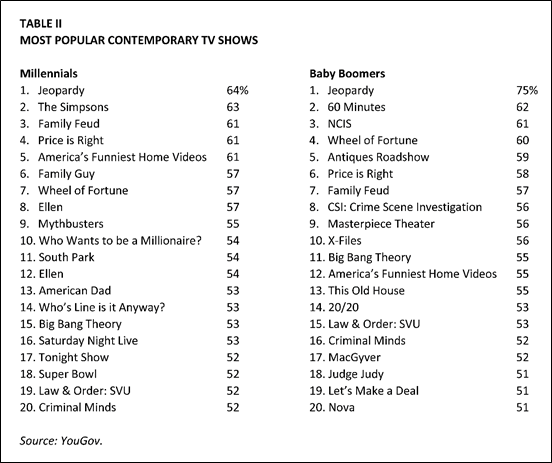 Even more revealing were the study’s findings on the most popular television programs among Millennials and Boomers. After all, people watch shows and not networks or channels. High profiled shows like HBO’s Game of Thrones and AMC’s The Walking Dead failed to make the top 20 among Millennials, who instead rated shows like The Simpsons, Family Guy, Ellen, The Big Bang Theory and even Law & Order: SVU as being more popular. As for Boomers, mostly games shows, Law and Order and PBS shows made up the top 20.