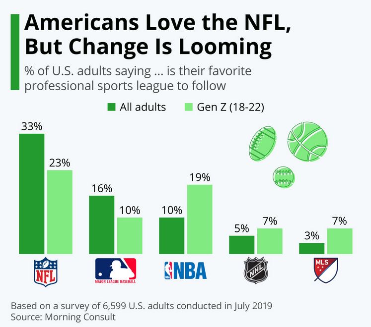 According to a poll conducted by Morning Consult in July 2019, the NFL is the #1 league to follow for 33% of U.S. adults, followed by the MLB (16%) and the NBA (10%). However, the NFL should be taking a look down the road because its popularity is fading with younger audiences, while the NBA, the NHL and MLS are increasing. Among 18 to 22-year-olds, the youngest cohort (Generation Z) in the survey, only 23% picked the NFL as their favorite league, with the NBA a not-too-distant second (19%).